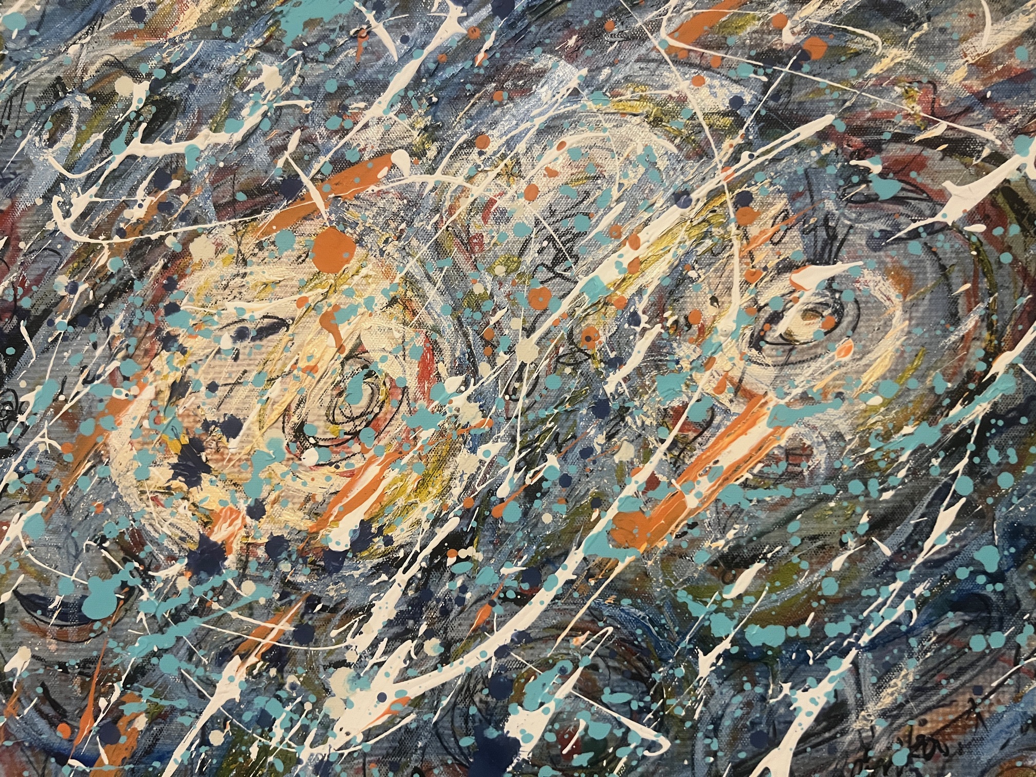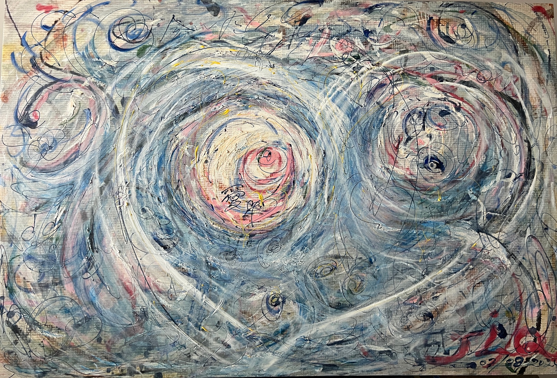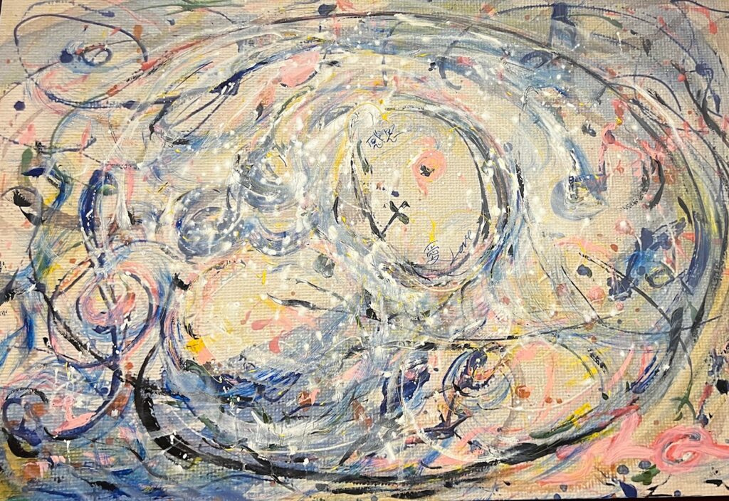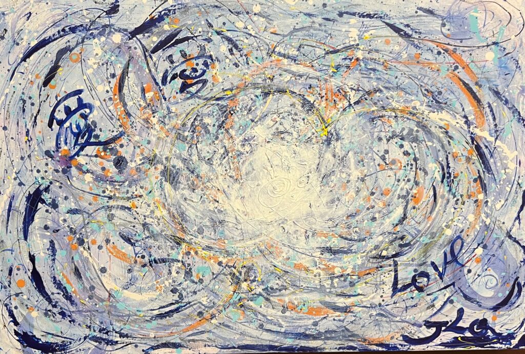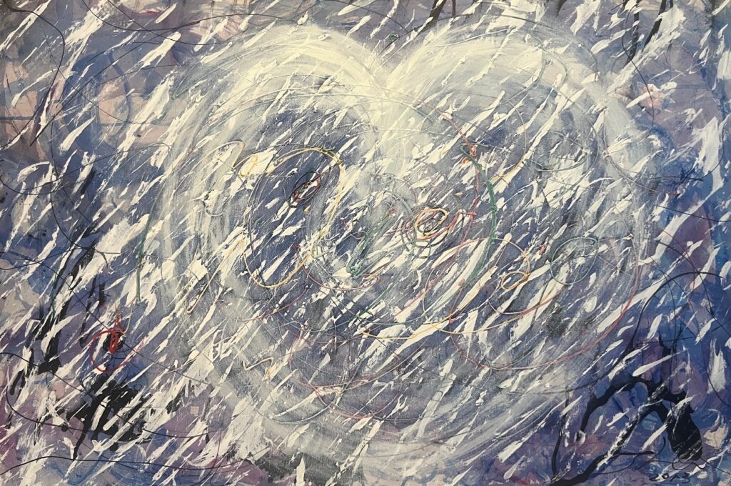 Handwritten words appear again and again — “愛” (love), “Love”, “感恩” (gratitude), “感悟” (insight) — not as decoration, but as mantras breathed onto the surface. They float, tangle, and glow amid drips, splatters, and bold strokes, reminding us that love is not fragile; it is resilient, persistent, and alive even in the wildest storm.