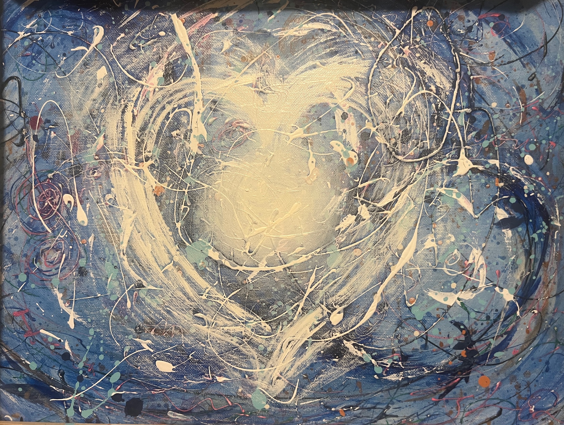 Each canvas begins in stillness: layers of deep blues and soft grays swirl like storms or winter skies, representing the outer turbulence we all face — wars, uncertainty, heartbreak, daily noise. Yet within that motion, a radiant heart emerges, encircled by endless spirals of energy. These spirals are not random; they are cycles of healing, forgiveness, and renewal, carrying threads of gold, coral, and emerald that weave through the chaos like veins of light.